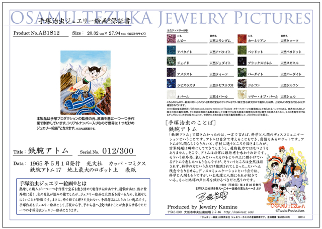 熟練した職人が一つ一つ手作業で宝石を敷き詰めていき、一つの絵画に仕上げます。そのため、世界でただ一つの手塚治虫ジュエリー絵画となります。・すべての製品には保証書が付きます。・株式会社手塚プロダクションが監修しています。・すべての製品には、世界限定のシリアルナンバーがつきます。