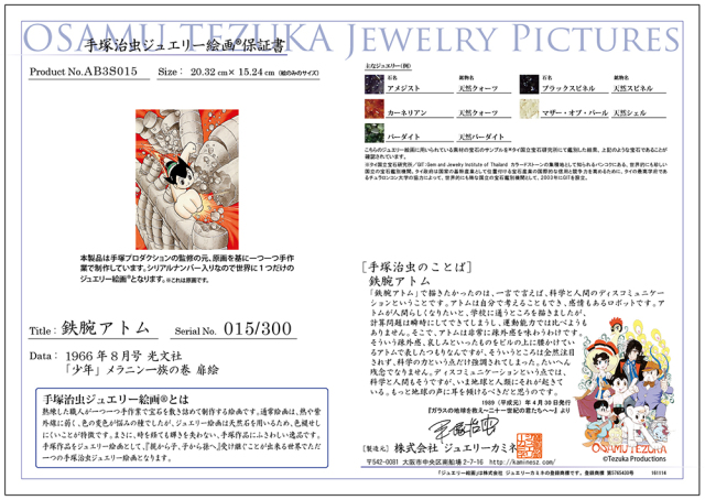 熟練した職人が一つ一つ手作業で宝石を敷き詰めていき、一つの絵画に仕上げます。そのため、世界でただ一つの手塚治虫ジュエリー絵画となります。・すべての製品には保証書が付きます。・株式会社手塚プロダクションが監修しています。・すべての製品には、世界限定のシリアルナンバーがつきます。