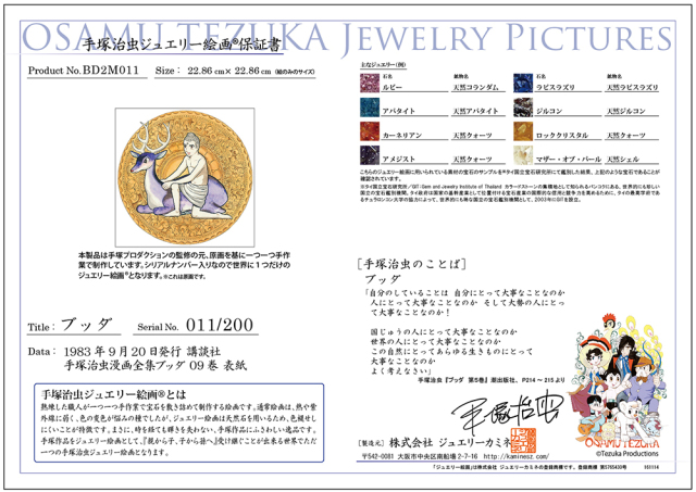 熟練した職人が一つ一つ手作業で宝石を敷き詰めていき、一つの絵画に仕上げます。そのため、世界でただ一つの手塚治虫ジュエリー絵画となります。・すべての製品には保証書が付きます。・株式会社手塚プロダクションが監修しています。・すべての製品には、世界限定のシリアルナンバーがつきます。