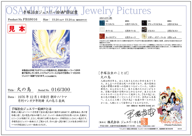 熟練した職人が一つ一つ手作業で宝石を敷き詰めていき、一つの絵画に仕上げます。そのため、世界でただ一つの手塚治虫ジュエリー絵画となります。・すべての製品には保証書が付きます。・株式会社手塚プロダクションが監修しています。・すべての製品には、世界限定のシリアルナンバーがつきます。【火の鳥】1954年から1988年。独立した物語が古代と未来のあいだを往還しつつ進められ、それぞれが繋がりを持ち、最後にはひとつの輪になるという構成で、手塚治虫の輪廻思想を根底にした壮大かつ深謀な作品。宇宙を、時間を自由に飛翔し、全てを包括する生命体の化身である火の鳥が、様々な人間たちによってくりひろげられるドラマを見守り続けます。そこには常に「人間とは、生命とは何か?」という問いかけが繰り返されています。