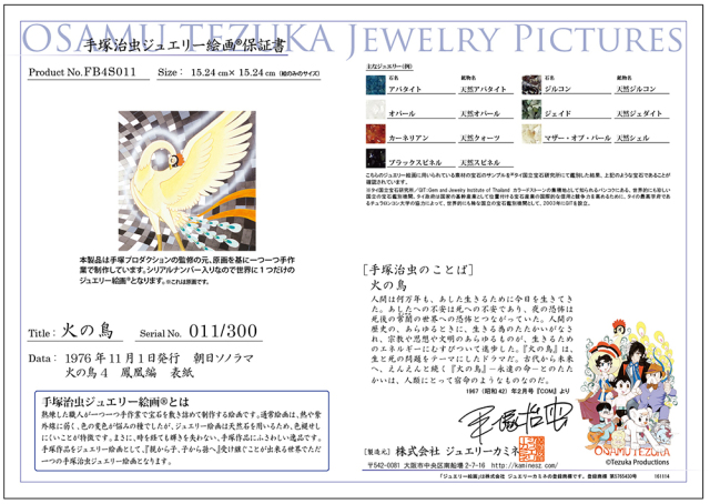 熟練した職人が一つ一つ手作業で宝石を敷き詰めていき、一つの絵画に仕上げます。そのため、世界でただ一つの手塚治虫ジュエリー絵画となります。・すべての製品には保証書が付きます。・株式会社手塚プロダクションが監修しています。・すべての製品には、世界限定のシリアルナンバーがつきます。【火の鳥】1954年から1988年。独立した物語が古代と未来のあいだを往還しつつ進められ、それぞれが繋がりを持ち、最後にはひとつの輪になるという構成で、手塚治虫の輪廻思想を根底にした壮大かつ深謀な作品。宇宙を、時間を自由に飛翔し、全てを包括する生命体の化身である火の鳥が、様々な人間たちによってくりひろげられるドラマを見守り続けます。 そこには常に「人間とは、生命とは何か?」という問いかけが繰り返されています。