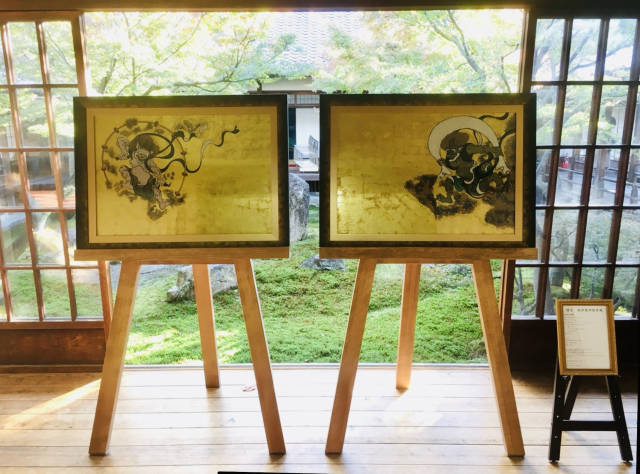 二曲一双の屏風全面に金箔を押し、右隻に風神、左隻に雷神を描いています。現在は京都国立博物館に寄託しており、 建仁寺では、高精細複製作品の屏風画が展示されております。