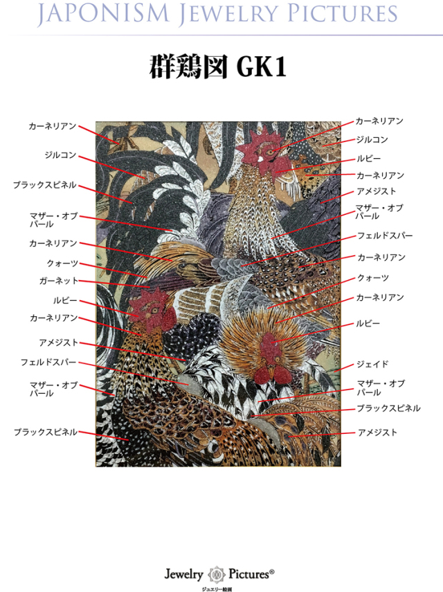「群鶏図」は1757年から1766年頃にかけて制作された、伊藤若冲の代表作「動植綵絵」の作品のひとつ。「鶏の画家」とも呼ばれる若冲の面目躍如たる画となっています。トサカの数から13羽の鶏が描かれていると分かりますが、羽が重なりあってまるで一塊の曼陀羅のよう、トサカの赤が鮮やかで印象的です。このような世界に誇る日本美術を、ジュエリー絵画の技法を用いて新しく作品にいたしました。
