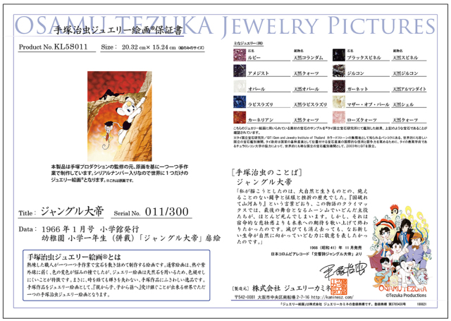 熟練した職人が一つ一つ手作業で宝石を敷き詰めていき、一つの絵画に仕上げます。そのため、世界でただ一つの手塚治虫ジュエリー絵画となります。・すべての製品には保証書が付きます。・株式会社手塚プロダクションが監修しています。・すべての製品には、世界限定のシリアルナンバーがつきます。
