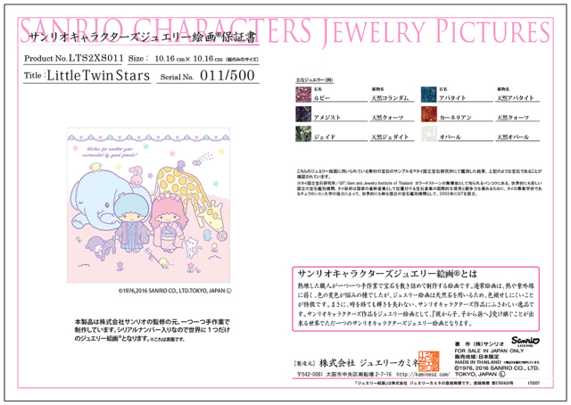 熟練した職人が一つ一つ手作業で宝石を敷き詰めていき、一つの絵画に仕上げます。そのため、世界でただ一つのサンリオジュエリー絵画となります。すべての製品には保証書が付きます。サンリオプロダクションが監修しています。すべての製品には、世界限定のシリアルナンバーがつきます。【リトルツインスターズ】ゆめ星雲の思いやり星でうまれた双子のきょうだい星。立派に輝く星になるために遠い星の国からやってきました。