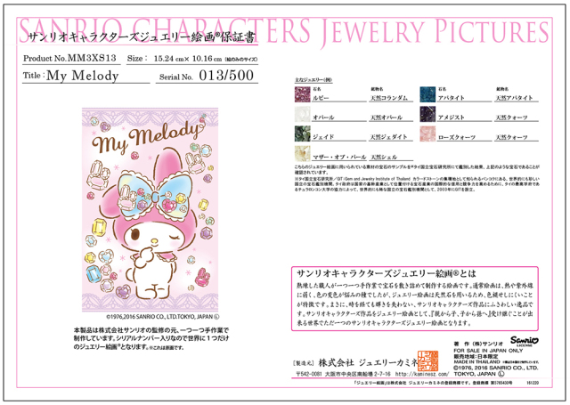 熟練した職人が一つ一つ手作業で宝石を敷き詰めていき、一つの絵画に仕上げます。そのため、世界でただ一つのサンリオジュエリー絵画となります。すべての製品には保証書が付きます。サンリオプロダクションが監修しています。すべての製品には、世界限定のシリアルナンバーがつきます。【ハローキティ】身長はりんご5個分。体重はりんご3個分。明るくて、優しい女のコ。