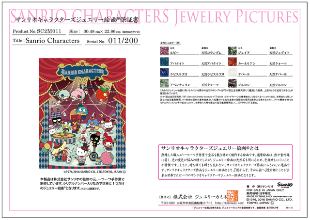 熟練した職人が一つ一つ手作業で宝石を敷き詰めていき、一つの絵画に仕上げます。そのため、世界でただ一つのサンリオジュエリー絵画となります。すべての製品には保証書が付きます。サンリオプロダクションが監修しています。すべての製品には、世界限定のシリアルナンバーがつきます。【サンリオキャラクターズ】
