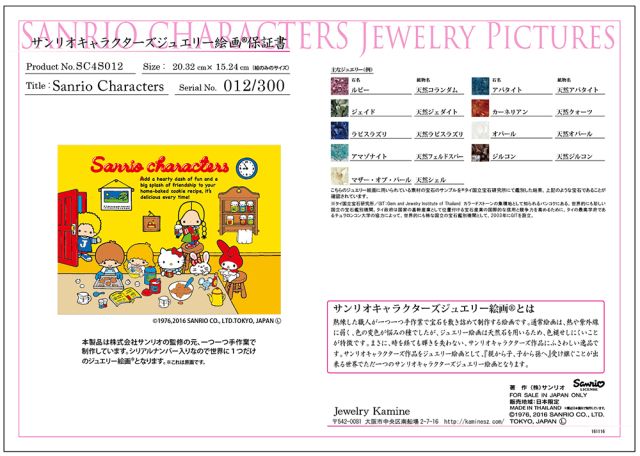 熟練した職人が一つ一つ手作業で宝石を敷き詰めていき、一つの絵画に仕上げます。そのため、世界でただ一つのサンリオジュエリー絵画となります。すべての製品には保証書が付きます。サンリオプロダクションが監修しています。すべての製品には、世界限定のシリアルナンバーがつきます。【サンリオキャラクターズ】